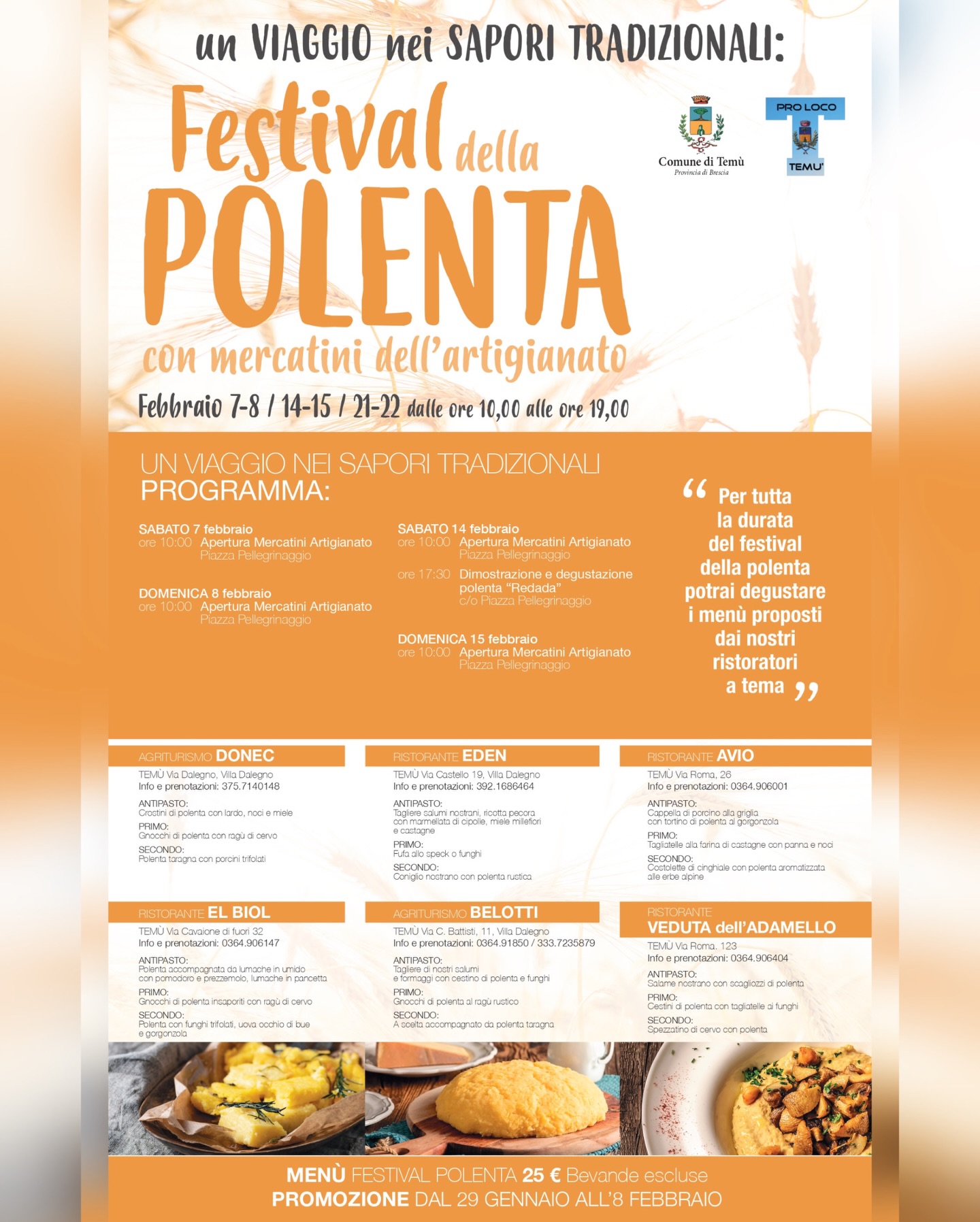 Per tre weekend consecutivi, i ristoratori locali proporranno degustazioni di polenta preparata secondo ricette tipiche del territorio e speciali menù tematici creati per l’occasione, permettendo a visitatori e buongustai di immergersi nei sapori autentici della tradizione camuna.