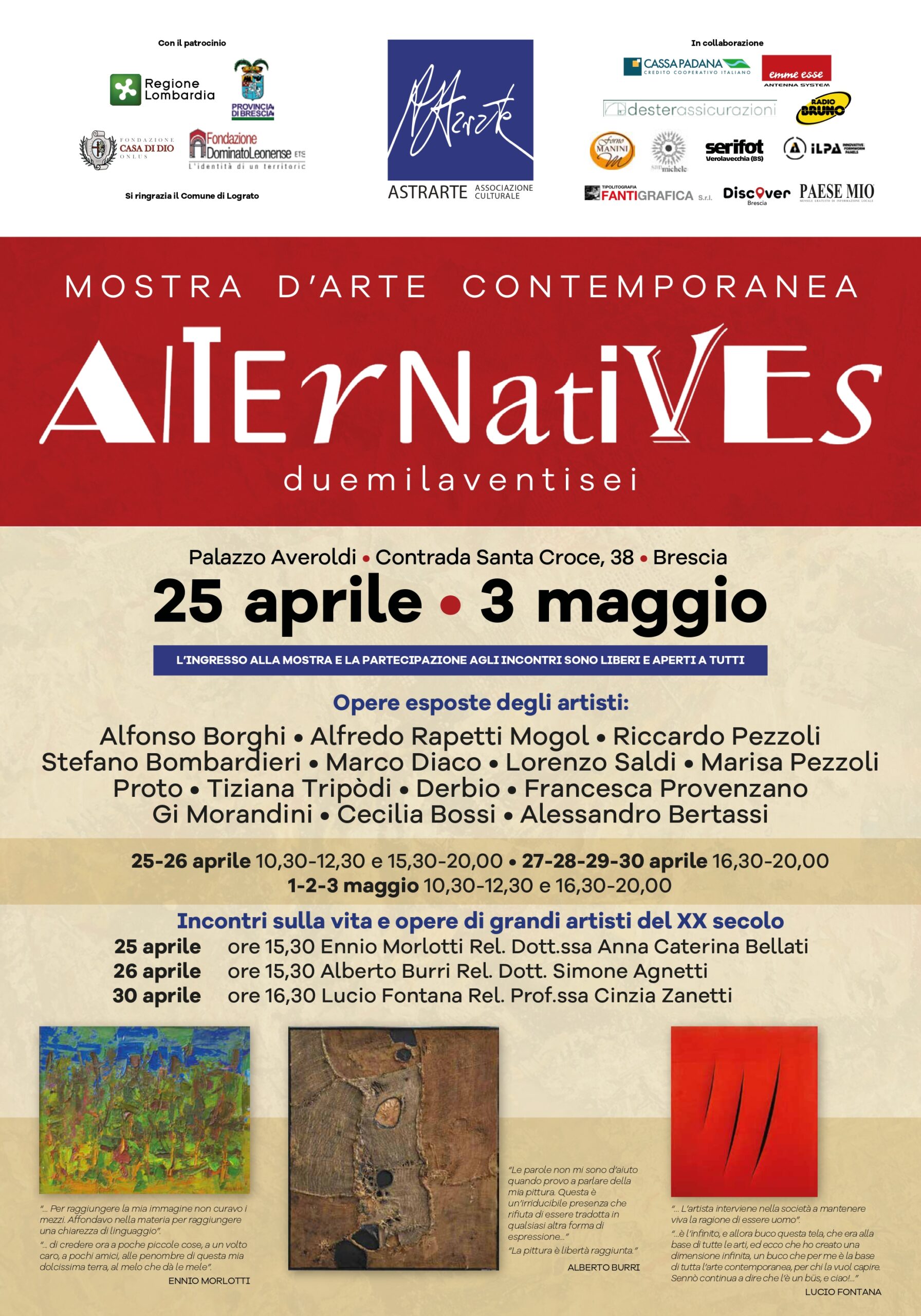 Durante il periodo espositivo in programma anche tre appuntamenti di approfondimento dedicati a figure fondamentali dell’arte italiana del Novecento: Ennio Morlotti, Lucio Fontana, Alberto Burri, a cura della Dott.ssa Anna Caterina Bellati, della Prof.ssa Cinzia Zanetti e del Dott. Simone Agnetti.